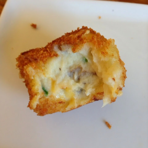 I have quite of bit of mash potato leftover from a family dinner and I was trying to figure out what to do with it. I thought croquettes would be good and then I thought what if I added everything you'd find in a loaded potato, rolled it up into a ball and fried it. Delicious!
